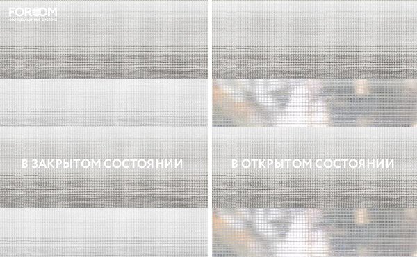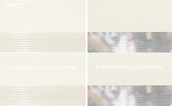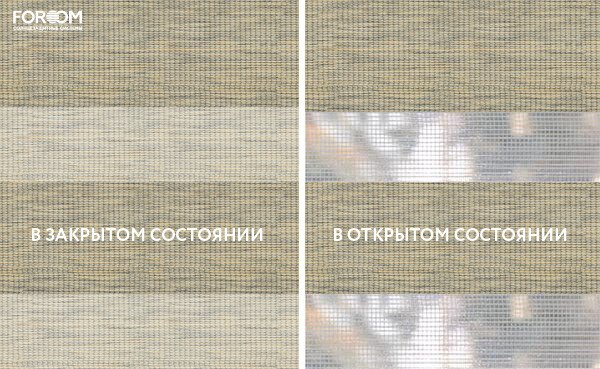 Полотно ткани, состоит из чередующихся горизонтальных полос – прозрачных и непрозрачных. Изменяя положение этих полос относительно друг другу, можно создать целых 3 режима регулировки светом. Например, чтобы в помещении стало светлее, нужно расположить прозрачные полосы друг напротив друга. Если разместить прозрачную и непрозрачную полосу параллельно друг другу, то можно добиться практически полного затемнения.